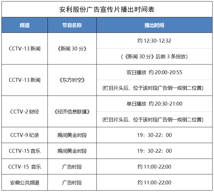 央視作為國家級媒體傳播平台,其公信力、影響力、權威性深受全國觀眾認可。2月1日至28日,安利股份宣傳片將在CCTV-13《新聞30分》、《東方時空》和CCTV-2《經濟信息聯播》等王牌欄目前後,以及CCTV-9、CCTV-15、安徽公共頻道等進行循環播放。本次是安利股份第二次在央視進行品牌宣傳,播放時長更長、內容更豐富、頻(pin)道(dao)與(yu)欄(lan)目(mu)更(geng)主(zhu)流(liu),收(shou)視(shi)觀(guan)眾(zhong)更(geng)廣(guang)泛(fan)。精(jing)品(pin)欄(lan)目(mu)與(yu)黃(huang)金(jin)時(shi)間(jian)的(de)宣(xuan)傳(chuan)有(you)利(li)於(yu)進(jin)一(yi)步(bu)提(ti)升(sheng)公(gong)司(si)品(pin)牌(pai)知(zhi)名(ming)度(du)及(ji)影(ying)響(xiang)力(li),擴(kuo)大(da)品(pin)牌(pai)傳(chuan)播(bo)覆(fu)蓋(gai)麵(mian),全(quan)力(li)推(tui)動(dong)公(gong)司(si)高(gao)質(zhi)量(liang)發(fa)展(zhan)。