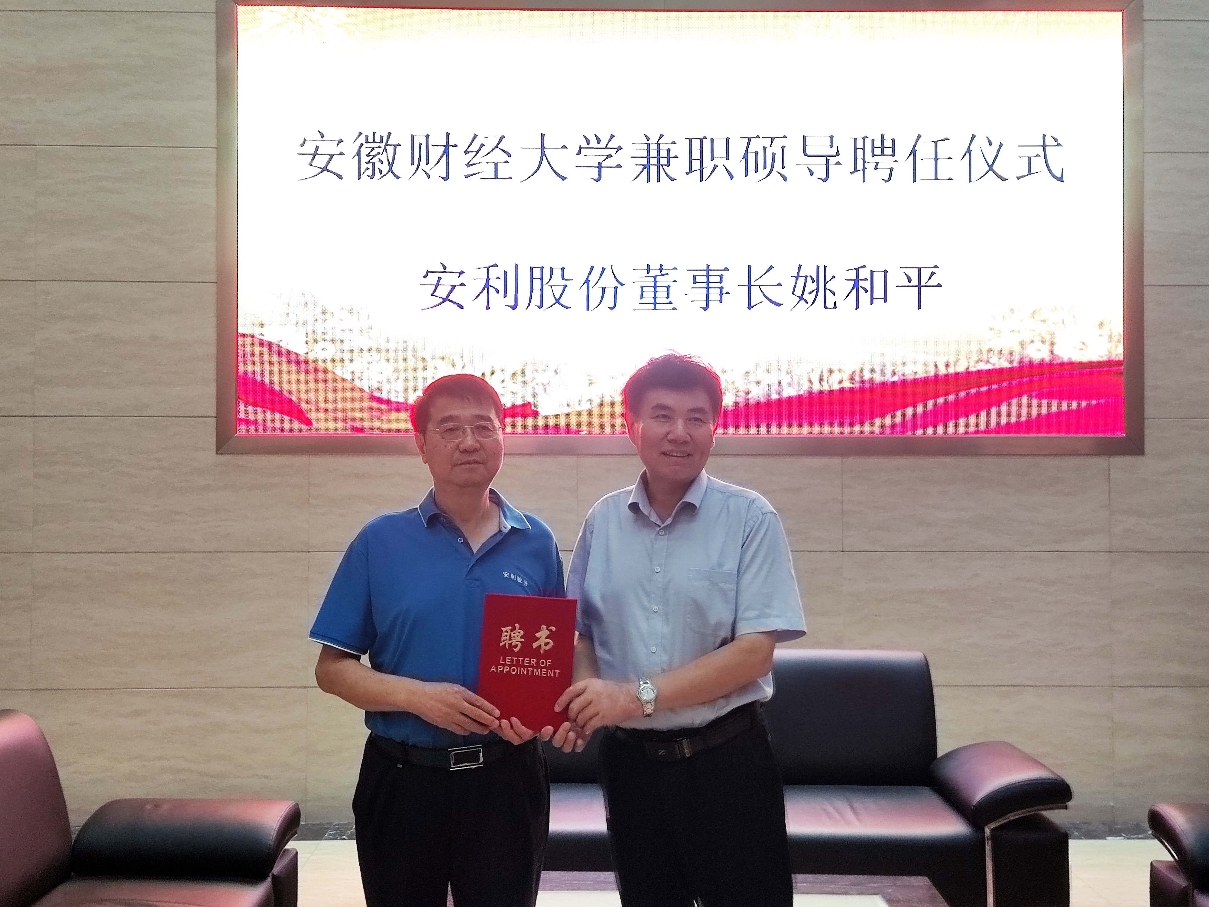 會後舉行了安徽財經大學兼職碩導續聘儀式,2011年12月姚和平首次受聘安徽財經大學碩士研究生導師,虞寶桃書記向姚和平頒發了新的續聘證書。