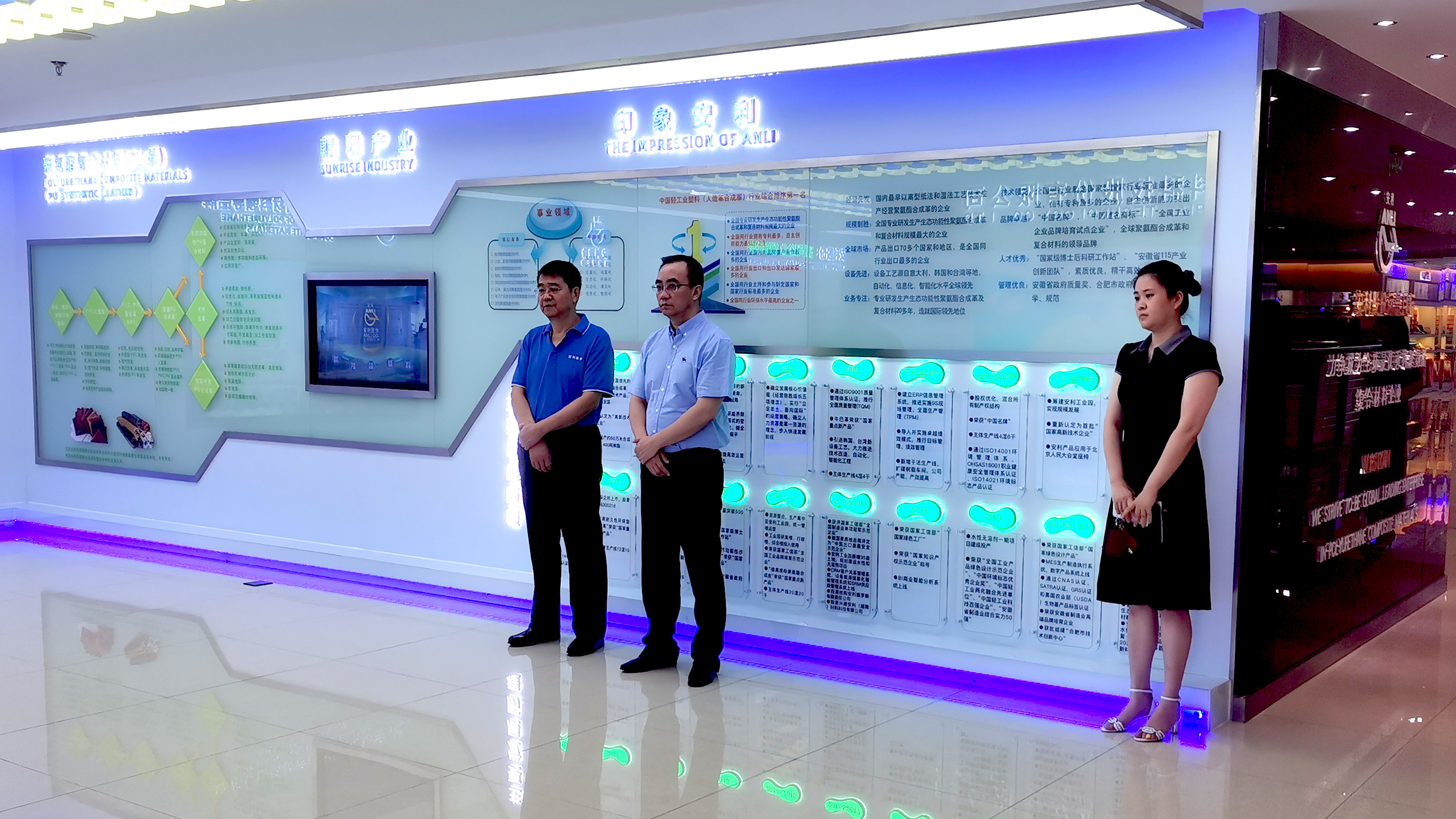 藍天一行參觀了安利股份形象和產品展廳,對公司顏值美麗、時尚流行、質感優良、功能出眾、生態環保的產品讚不絕口。當了解到公司產品廣泛應用於功能鞋材、沙發家居、電子產品、體育裝備、工程裝飾、汽車內飾、手袋箱包等領域,與全球70多億人的衣、用、住、行息息相關後,藍天書記對公司經營取得的成績,以及公司為合肥民營經濟發展做出的貢獻給予了高度讚揚和肯定。